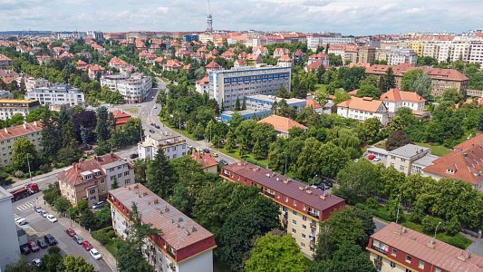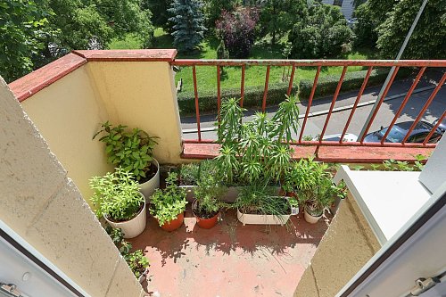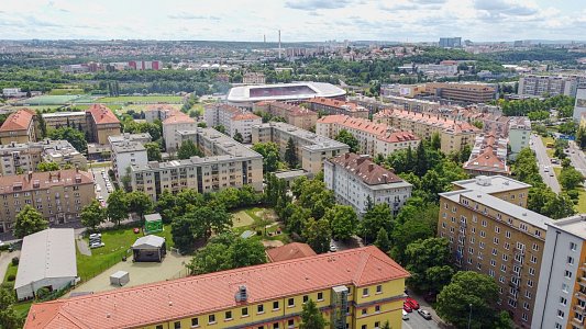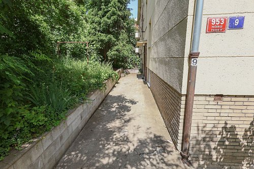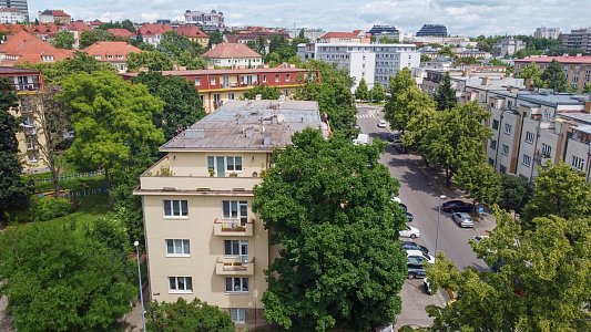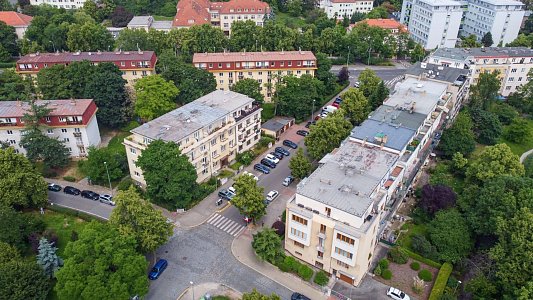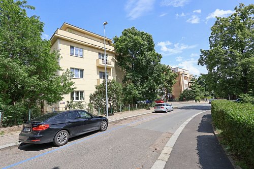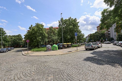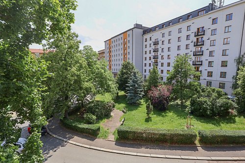 Byt se nachází v klidné jednosměrné ulici s výhledem do parku, přičemž je jen pár metrů od stanic autobusu, metra a tramvaje.