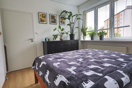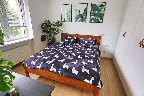 Ložnice o rozloze 14 m2 je vybavena velkou šatní skříní, dvoulůžkem a komodou.