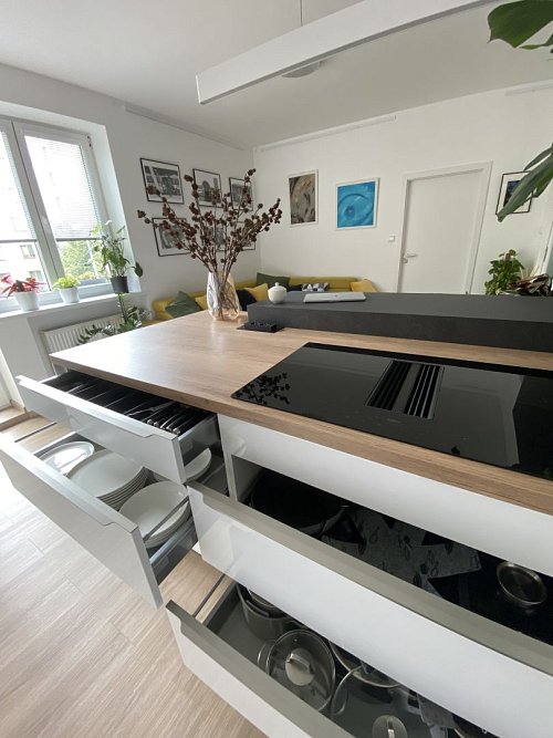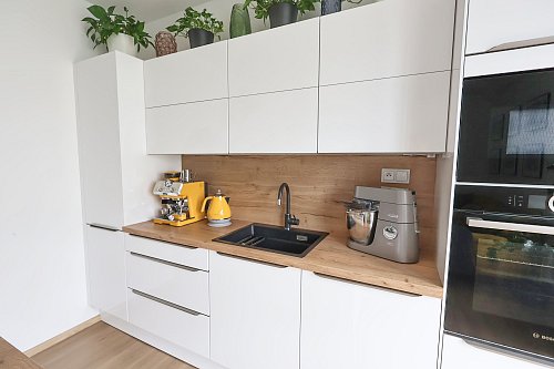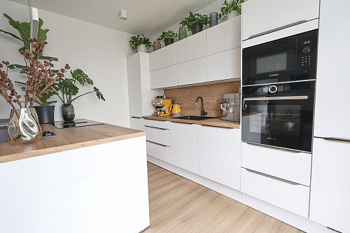 Kuchyně je navržena s maximálním využitím prostoru po celé délce a vybavena kvalitními značkovými spotřebiči. Indukční varná deska s integrovaným odsáváním, parní elektrická trouba s přednastavitelnými programy, mikrovlnka, XXL myčka s eco programy a větší lednička se šestým smyslem s mrazákem.