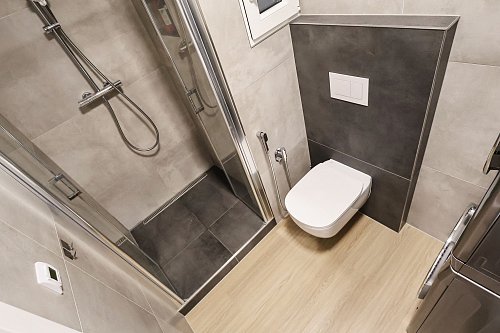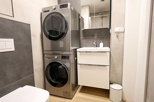 Koupelna disponuje vytápěnou podlahou a vytápěným sprchovým koutem. V koupelně se nachází chytrá pračka a sušička. Sušička LG s energetickou třídou A+++ je maximálně tichá, má kapacitu 9 kg a funkce pro alergiky, zatímco pračka LG s energetickou třídou A+++ má kapacitu 10,5 kg a také 10letou záruku na motor. Mezi pračkou a sušičkou je umístěn mezikus.