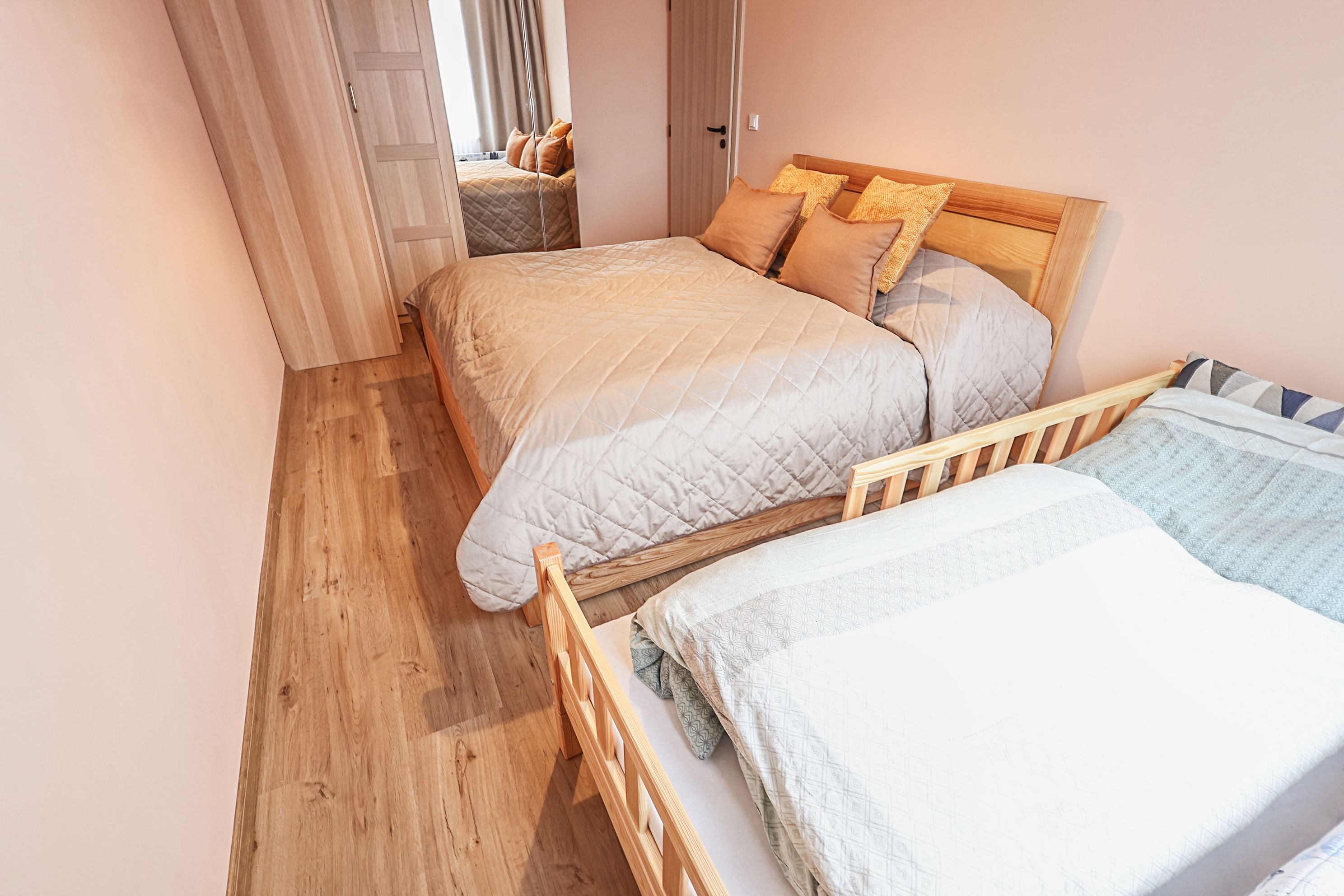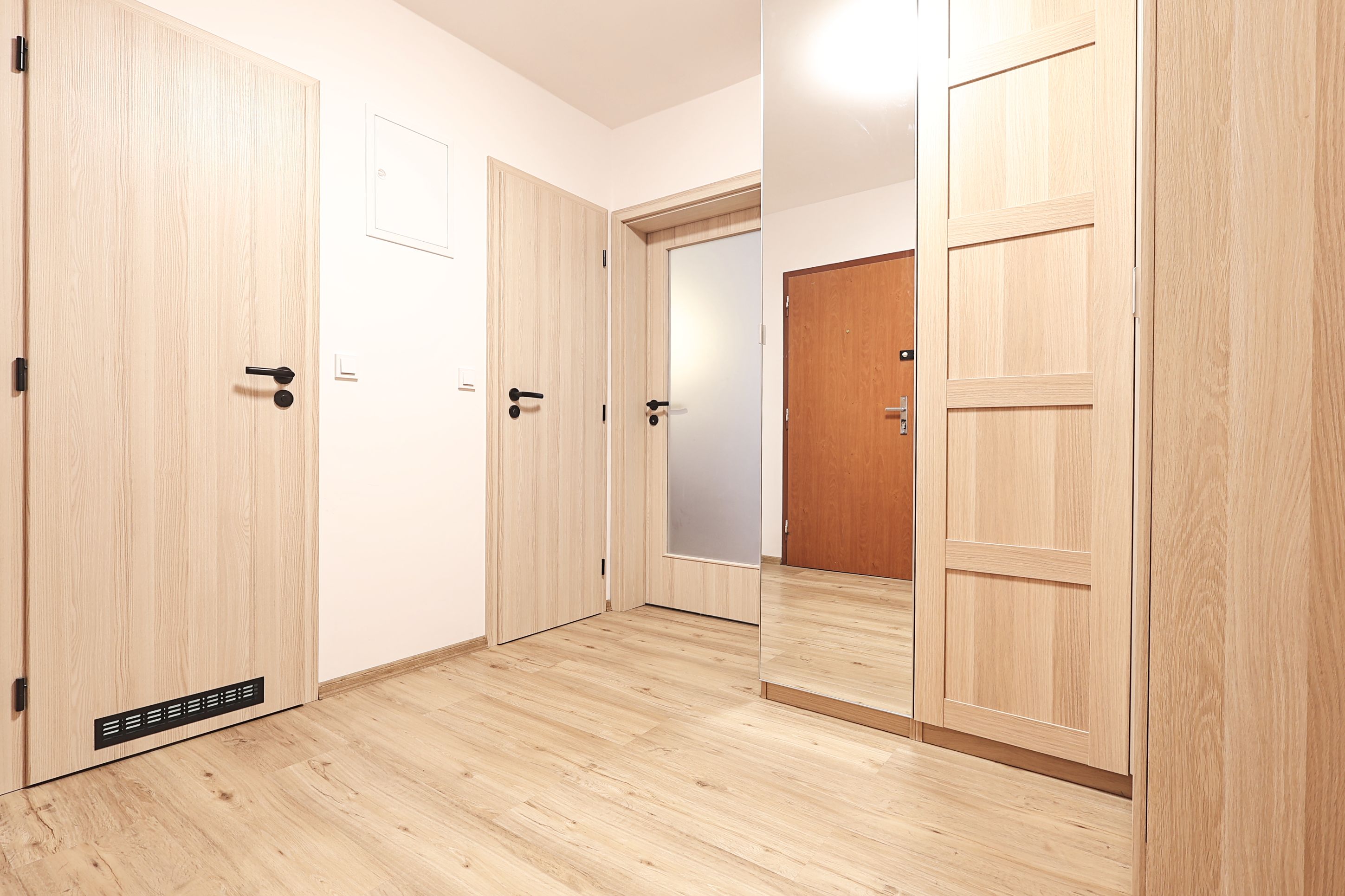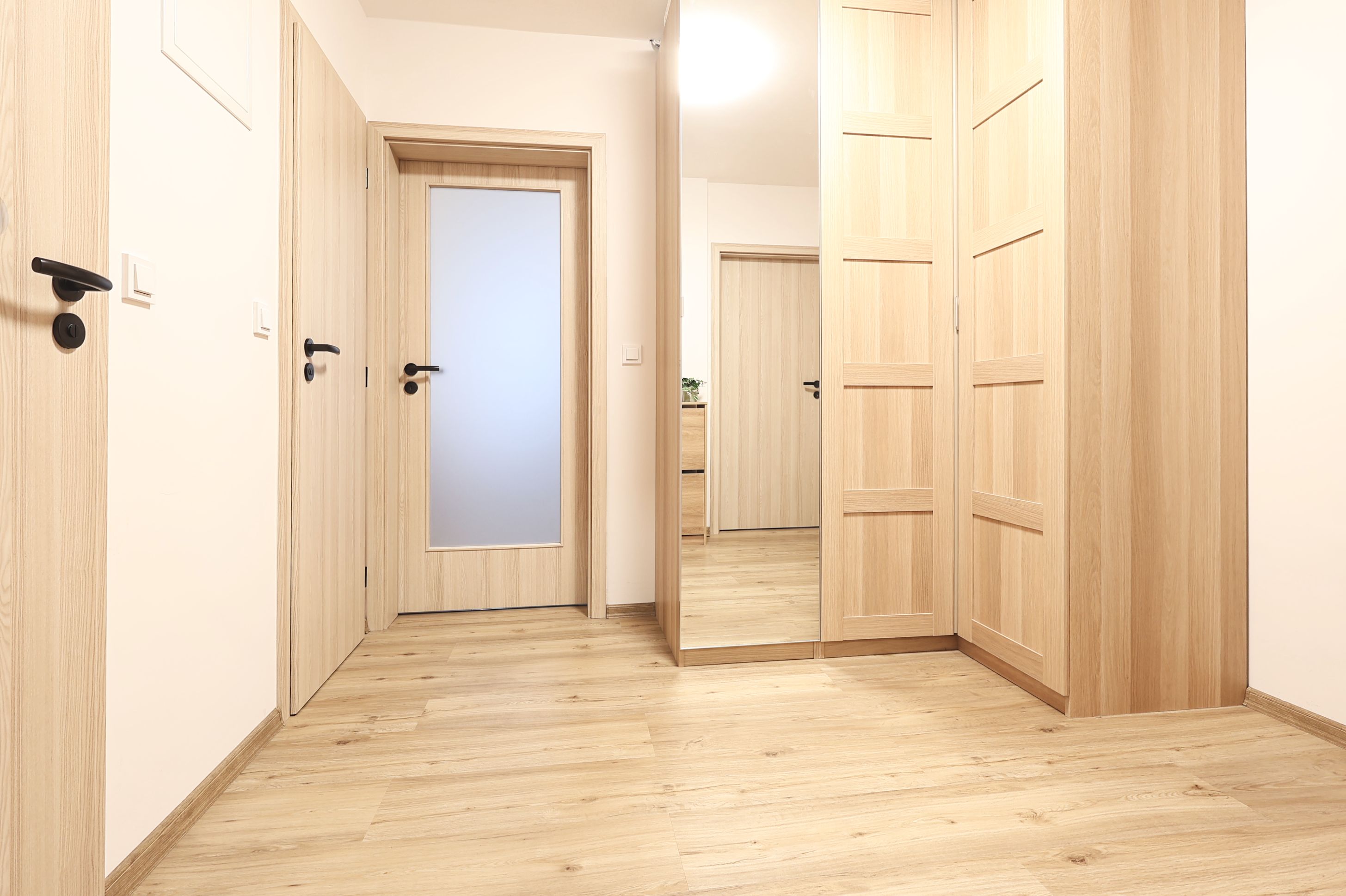 Dveře a obložky ve světlém dekoru, stejném jako šatní skříně.