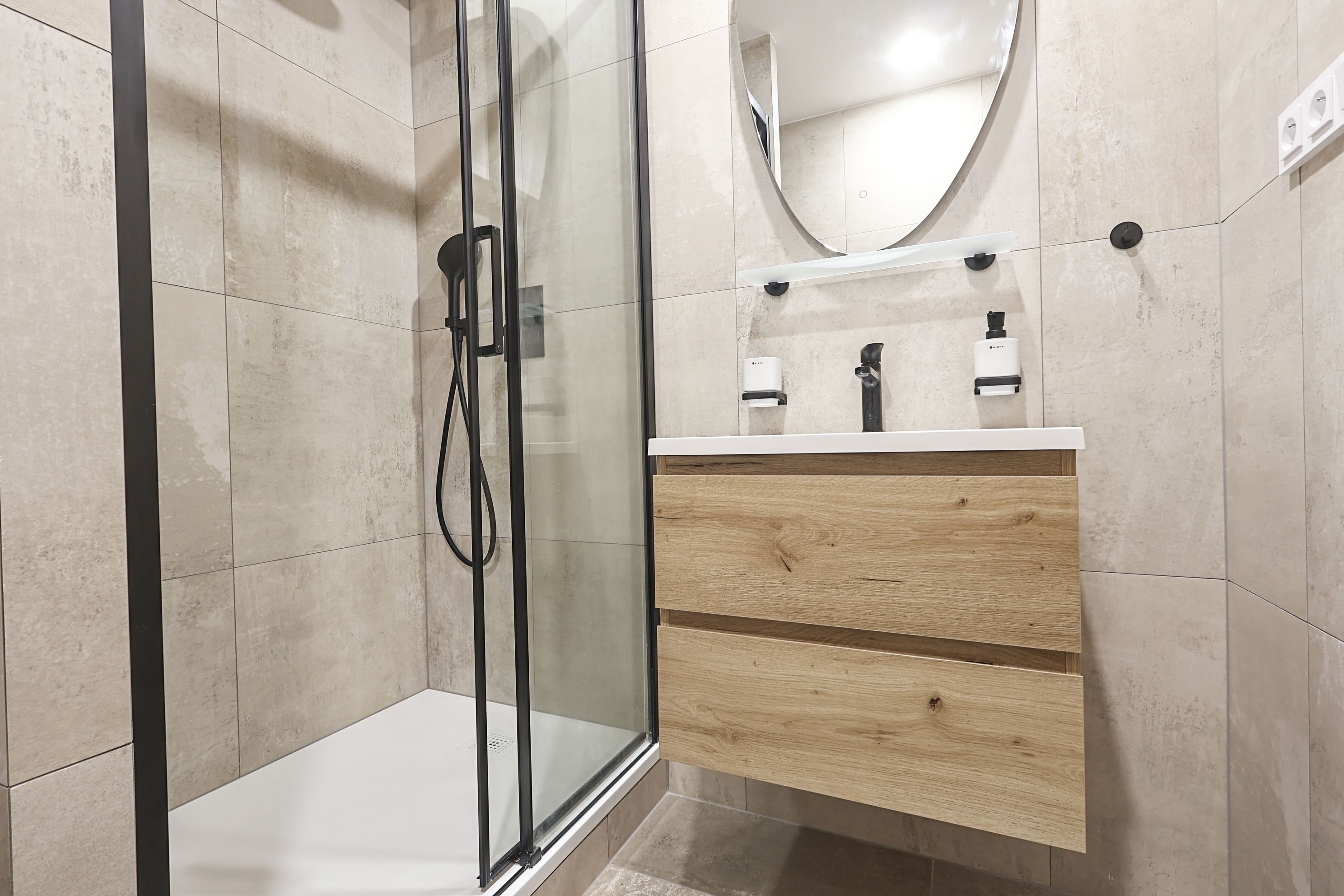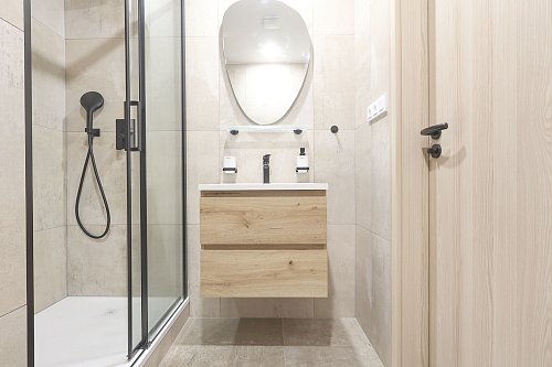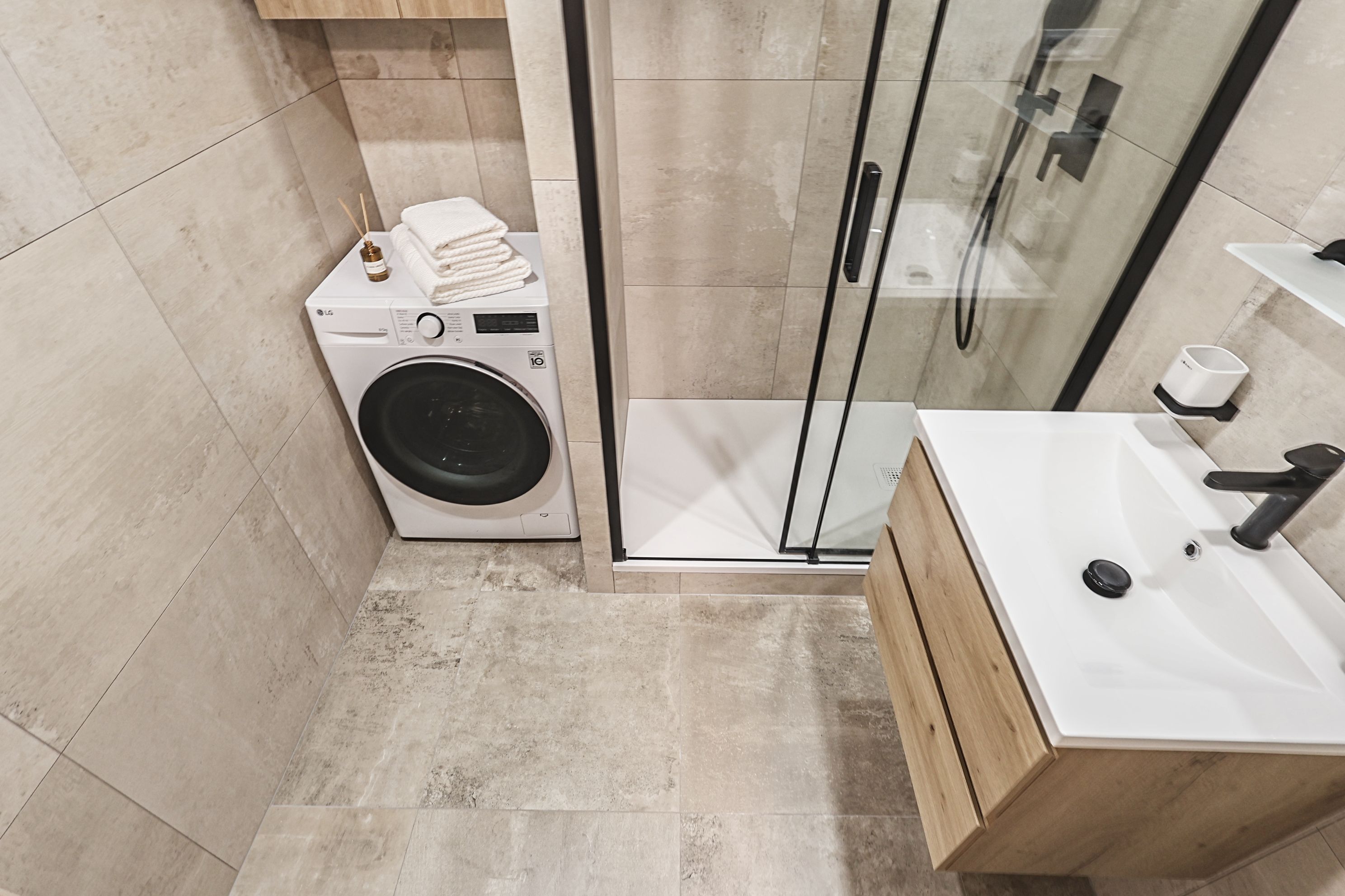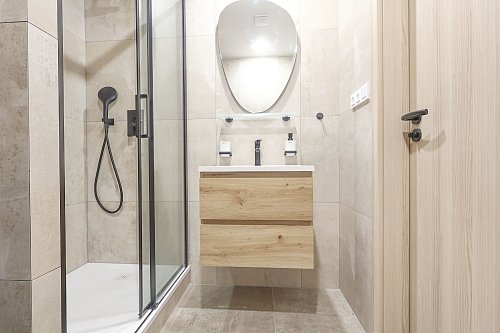 Koupelna se sprchovým koutem a odděleným místem na pračku a případně i sušičku, dva samostatné elektrické okruhy.