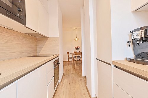 Kuchyně je navržena s maximálním využitím prostoru po celé délce je vybavena kvalitními značkovými spotřebiči. Indukční varná deska na 400V poskytuje velký okamžitý výkon dále široká myčka, el. trouba, odsavač par, lednice s mrazákem. Na kuchyň navazuje jídelna propojená s obývacím pokojem ze kterého je vchod na zasklenou lodžii s výhledem do zeleně a Prahu přes nízké rodinné domy.