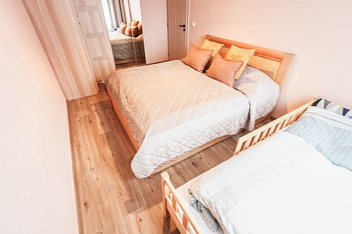 Byt zrekonstruovaný kvalitně v každém detailu, na povrch stěn byla použitá sádrová prodyšná stěrka a kvalitní barva Dulux, vinylové podlahy s velkým kročejovým útlumem a větší ochranou vrstvou. Do nově postavených stěn a celého bytu nové elektrické rozvody. Ve sprše podomítková baterie. Stěna mezi pokoji s vyšším zvukovým útlumem.